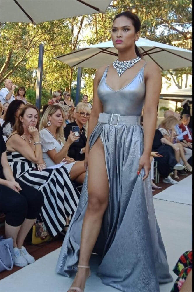 Rachel is size 10 and 165cm. Plus 10cm heels.