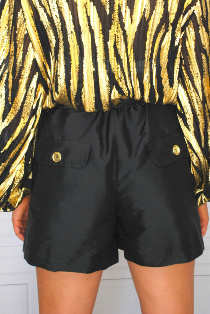These shorts fit a generous size 10. Stylish taffeta fabric, to elevate this style into chic evening wear. Easy relaxed style with elastic waist and sash coverage. Internal side pockets and false pocket flaps on the back and front, trimmed with gold buttons.