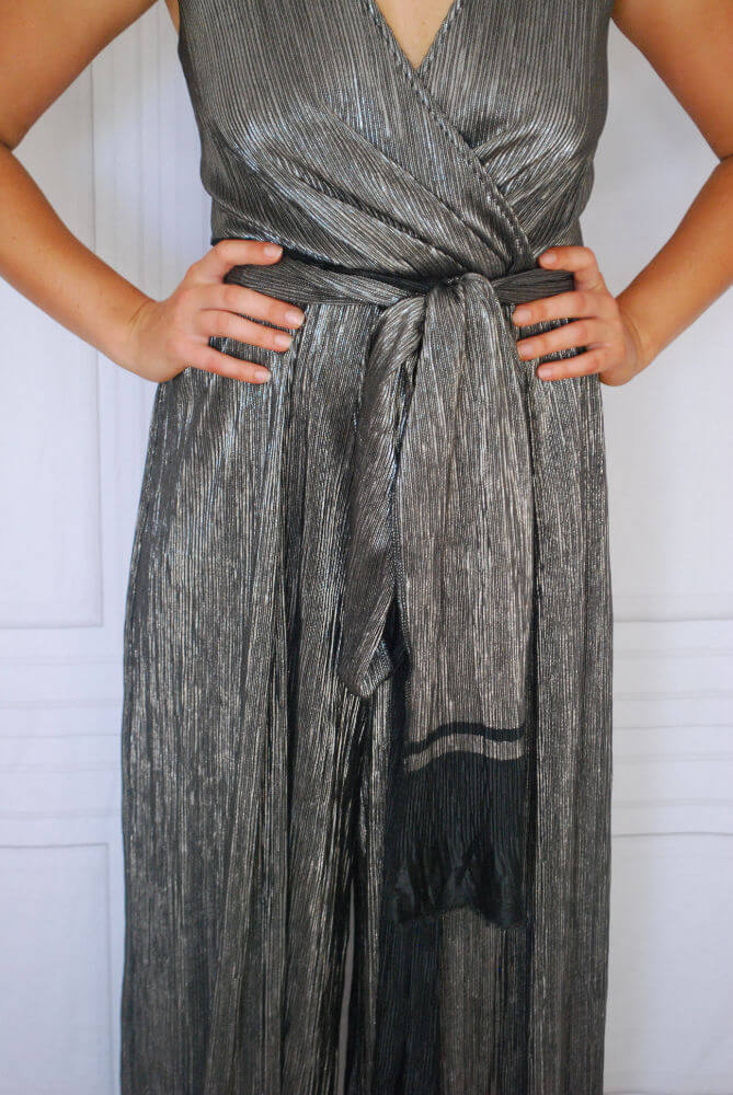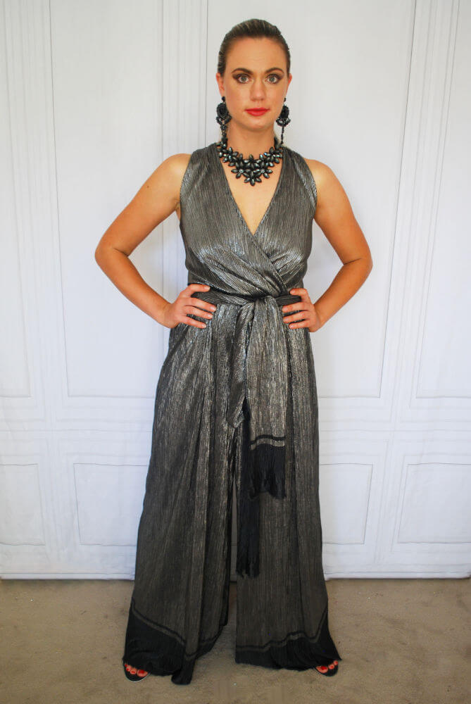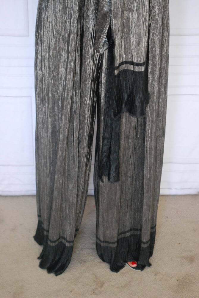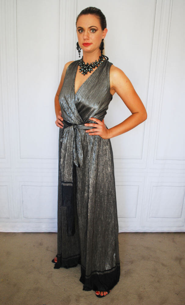 This is a generous size jumpsuit. Made from a stunning shimmery crinkle fabric in slate grey with a black border on the hems and long sash. It has a deep V neckline with tuck fronting and elastic waist for easy comfort and pull up style. The back has feature ties. Inner leg length (crotch to hem) is 82cm, ideally suited for a tall height of 175cm and upwards.