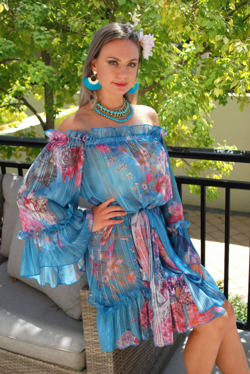 Sits off the shoulder with frills on long sleeves and hemline. Fabric is slightly transparent with a silver grain pattern. Suggest wearing nude briefs or half slip.