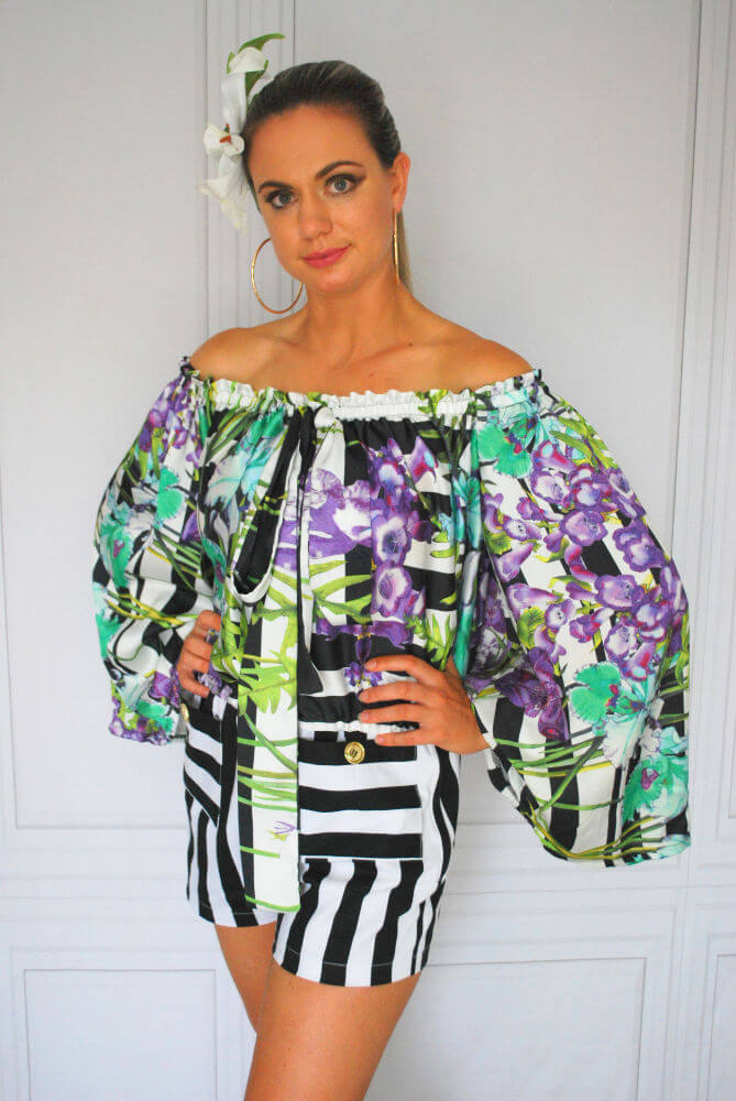 Top has loose long sleeves, elastic bodice and waist with a halter neck tie. Shorts have 2 front pockets with gold decorative buttons, side closing zip and concealed waistband.